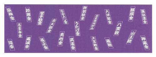 本染注染、力強い江戸文字を千社札風に散りばめたシンプルなデザインで作成しました。