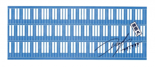 ピアノのイラストを背景に青、黒2色プリントでオリジナルのデザインで作成しました。